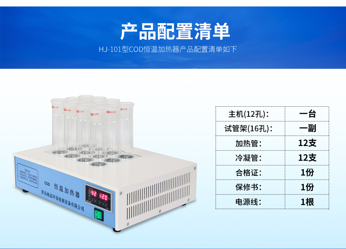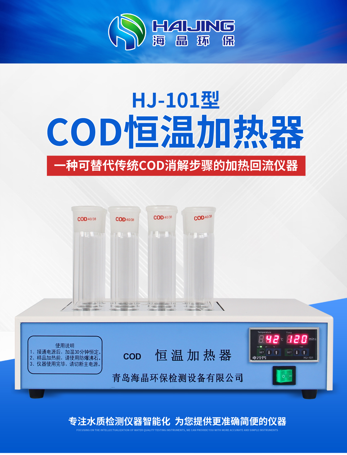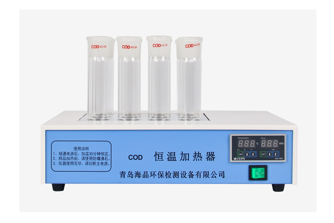 HJ-101型COD恒溫加熱器是目前使用率非常廣泛的一款加熱器,性能穩定,加熱均勻; 采用新型溫控器,升溫速度快,精度高,溫度恒定均勻。 可自動控制加熱時間,當加熱樣品沸騰即開始計時。在COD實驗時必不可少,其性能特點完全滿足實驗所需。是科研人員的得力助手!