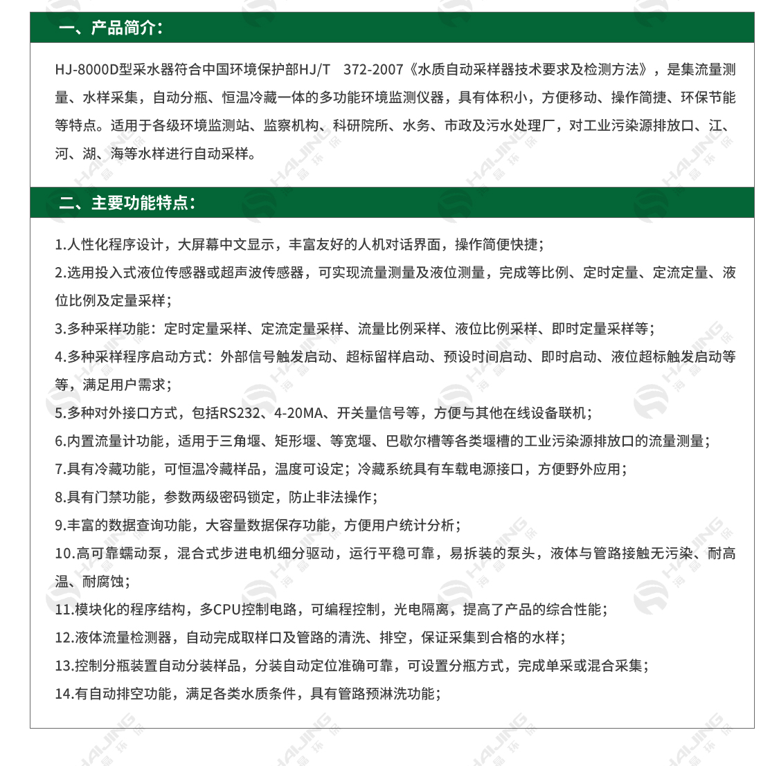 一、產品簡介: HJ-8000D型采水器符合中國環境保護部HJ/T 372-2007《水質自動采樣器技術要求及檢測方法》,是集流量測量、水樣采集,自動分瓶、恒溫冷藏一體的多功能環境監測儀器,具