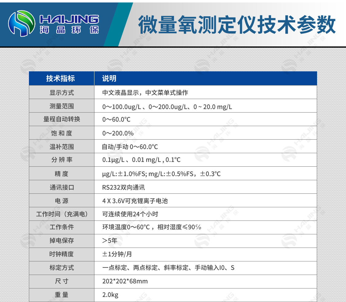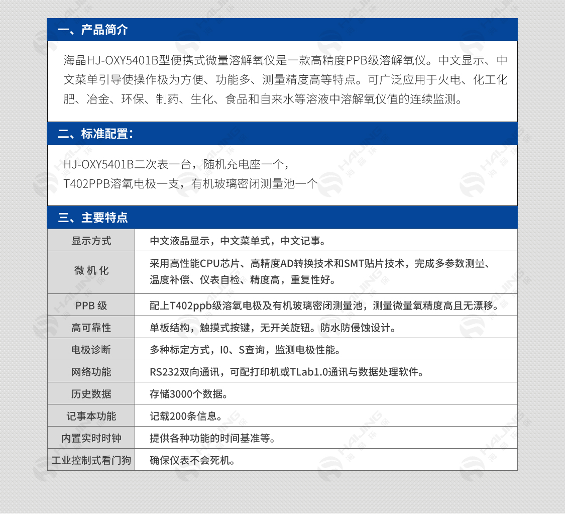 一、產品簡介: 海晶HJ-OXY5401B型便攜式微量溶解氧儀是一款高精度ppb級溶解氧儀。中文顯示、中文菜單引導使操作極為方便、功能多、測量精度高等特點??蓮V泛應用于火電、化工化肥