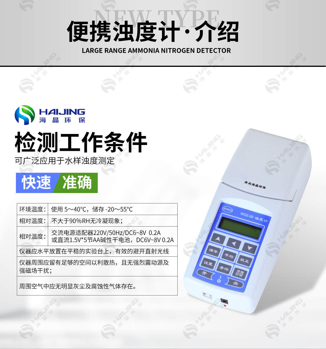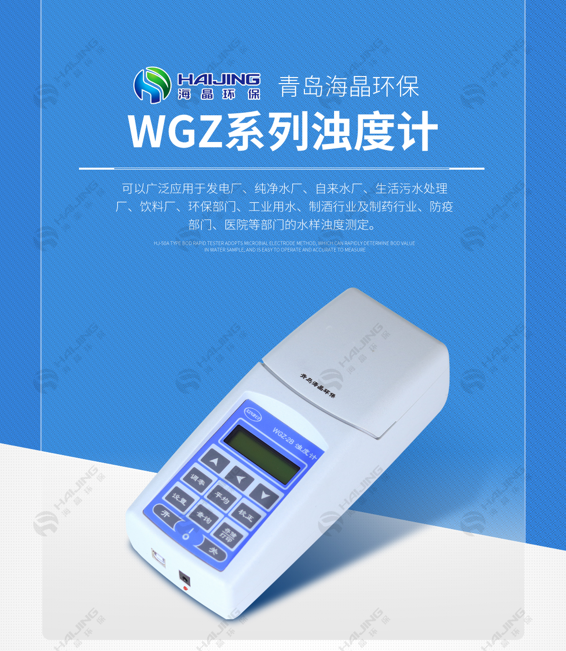 用于測量懸浮于水或透明液體中不溶性顆粒物質所產生的光的散射程度,并能定量表征這些懸浮顆粒物質的含量。可以廣泛應用于發電廠、純凈水廠、自來水廠、生活污水處理廠、飲料廠、環保部門、工業用水、制酒行業及制藥行業、防疫部門、醫院等部門的濁度測量。