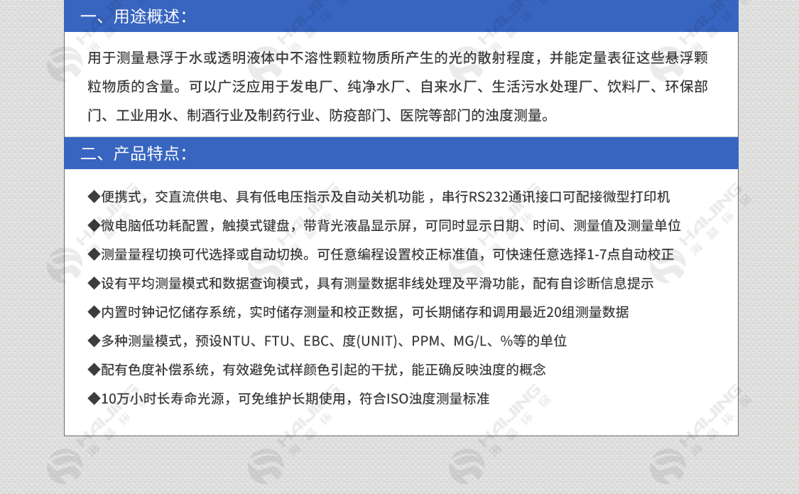 一、用途概述: 用于測量懸浮于水或透明液體中不溶性顆粒物質所產生的光的散射程度,并能定量表征這些懸浮顆粒物質的含量??梢詮V泛應用于發電廠、純凈水廠、自來水廠、生活污