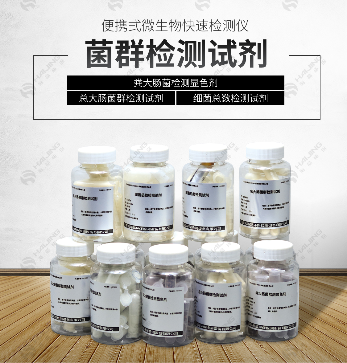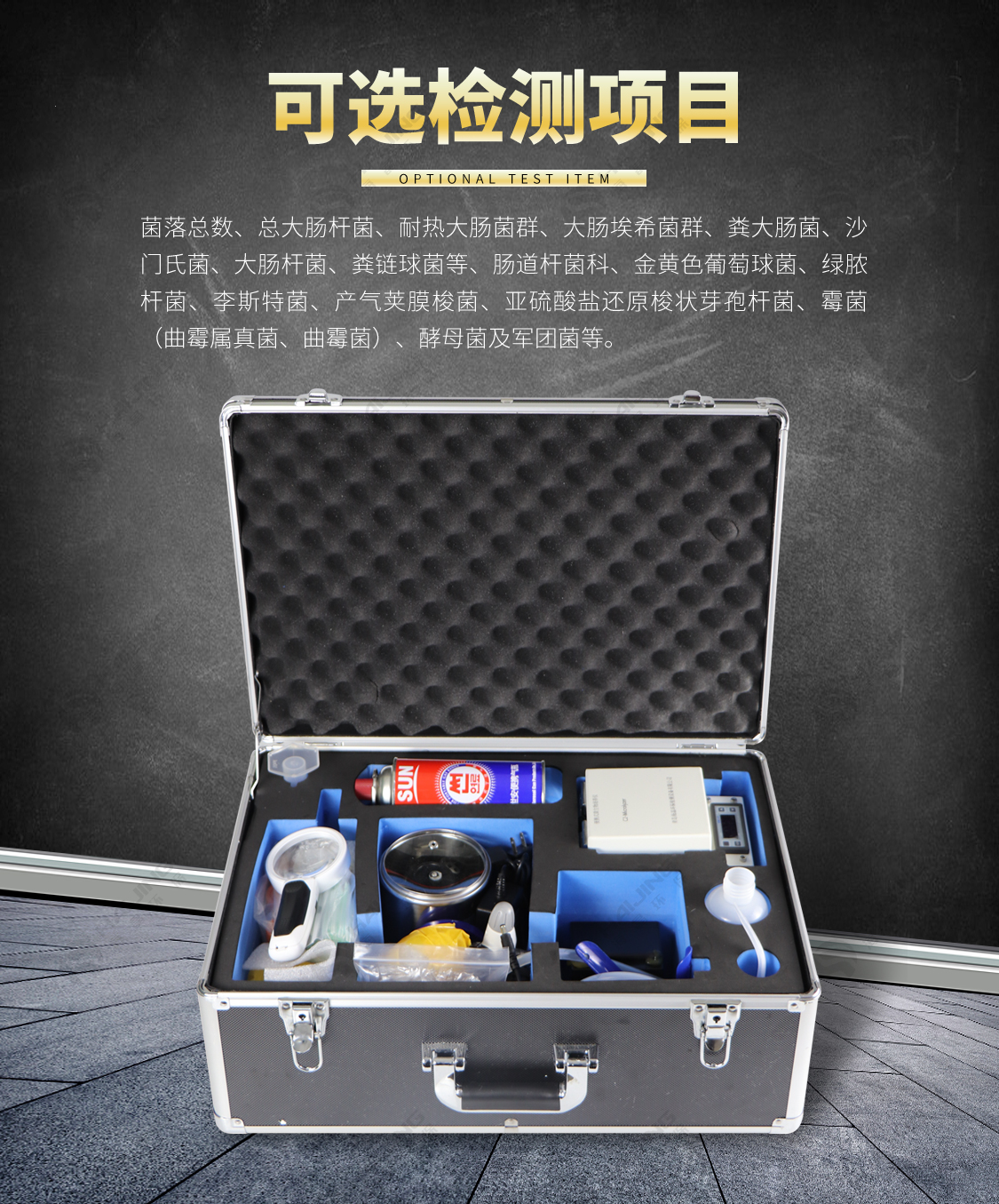 菌落總數、總大腸桿菌、耐熱大腸菌群、大腸埃希菌群、糞大腸菌、沙門氏菌、大腸桿菌、糞鏈球菌等、腸道桿菌科、金黃色葡萄球菌、綠膿桿菌、李斯特菌、產氣莢膜梭菌、亞硫酸鹽還原梭狀芽孢桿菌、霉菌(曲霉屬真菌、曲霉菌)、酵母菌及軍團菌等。