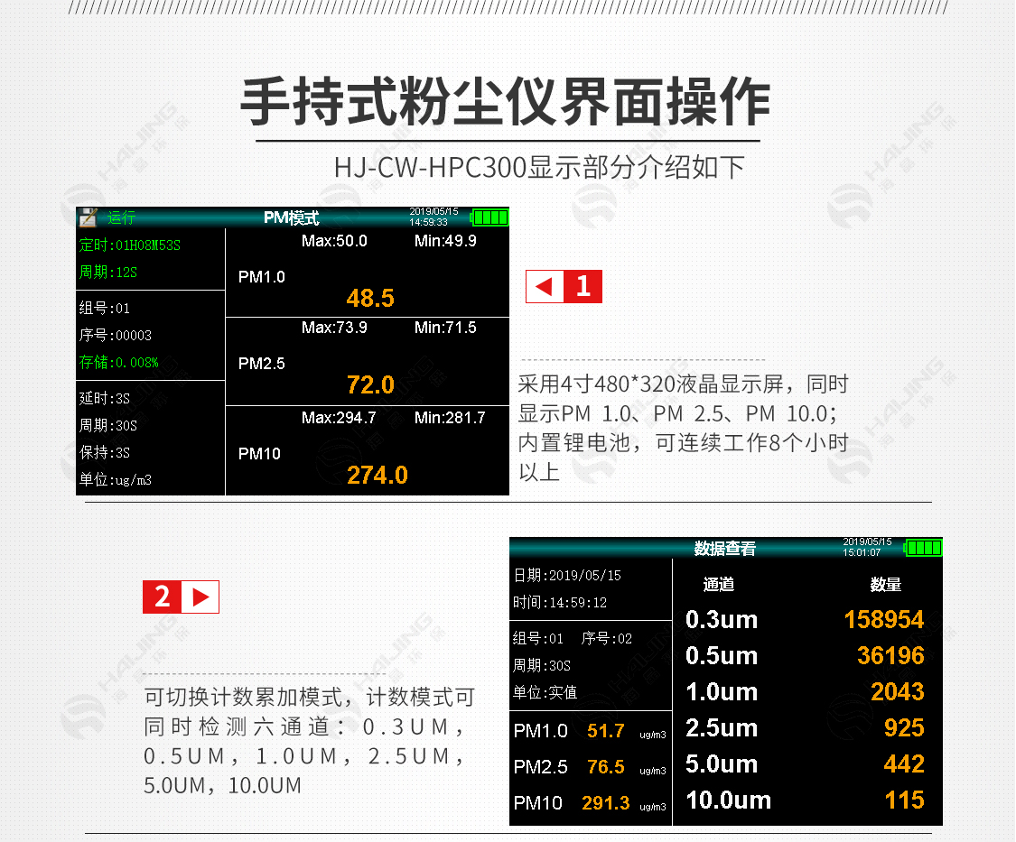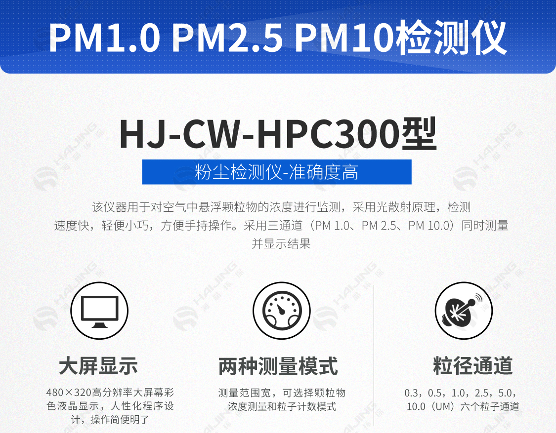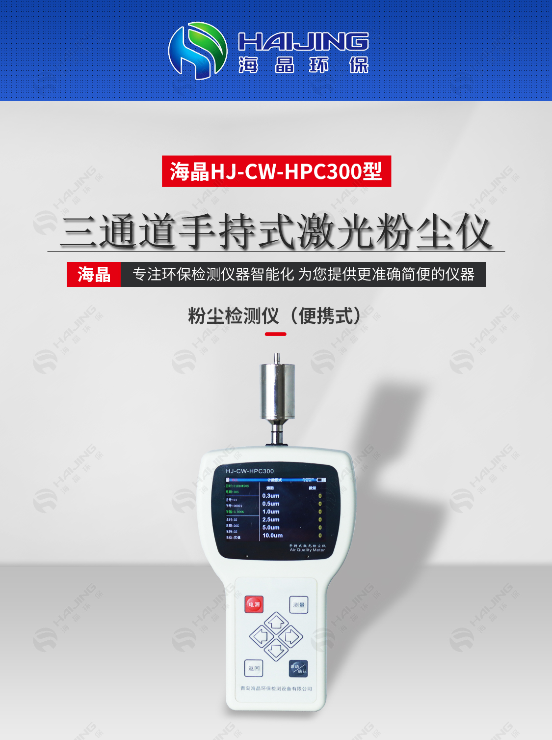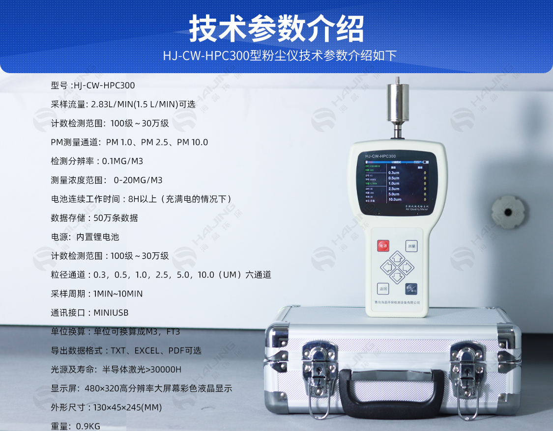 一、概述 HJ-CW-HPC300 手持式激光粉塵儀用于對空氣中懸浮顆粒物的濃度進行監測,采用光散射原理,檢測速度快,輕便小巧,方便手持操作。采用三通道(PM 1.0、PM 2.5、PM 10.0)同時測量并顯示結果,該方法符合衛生部wst206-2001《公共場所中可吸入顆粒物(PM10)測定方法——光散射法》,符合JJF1190-2008《塵埃粒子計數器校準規范》,符合國家計量技術規范JJF1716-2018。