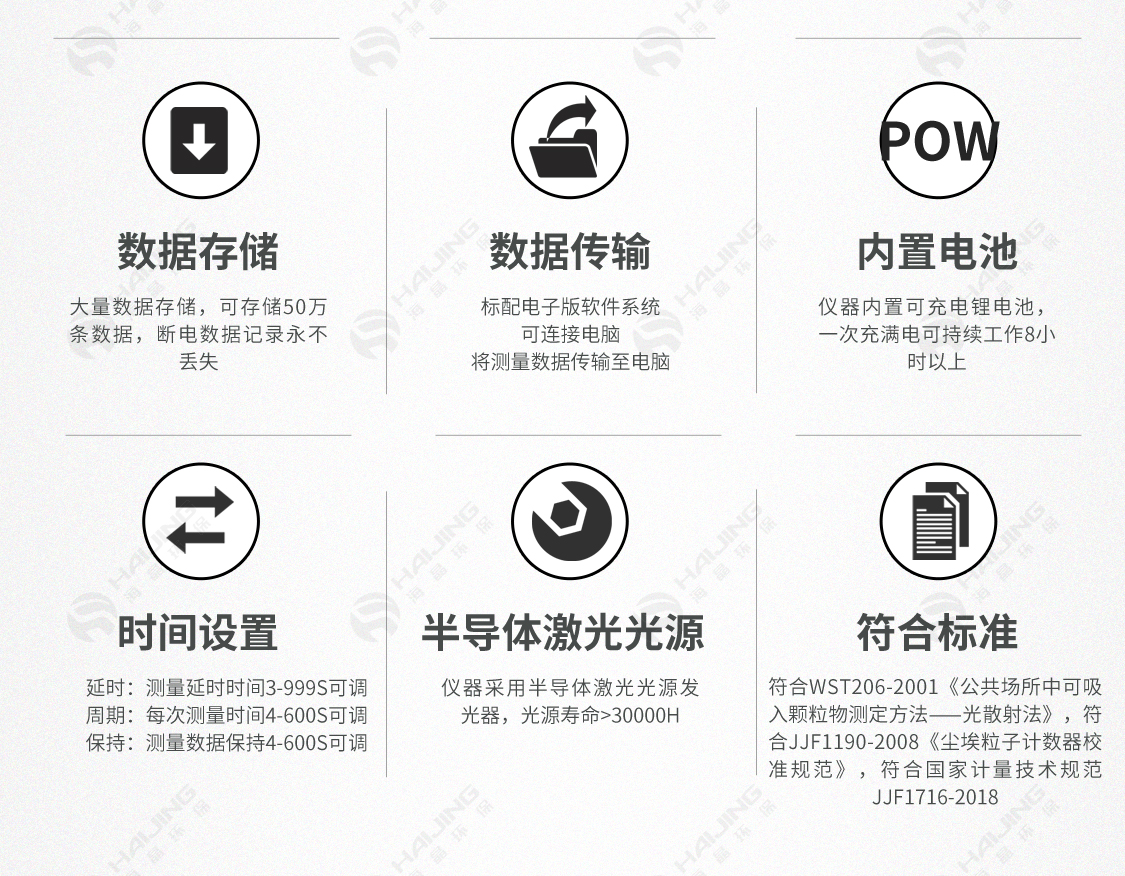 本儀器采用半導體激光光源,液晶屏顯示,其體積小、重量輕、檢測精度高、功能操作簡單明了,電腦控制,可貯存、打印采樣結果,使用十分便利。