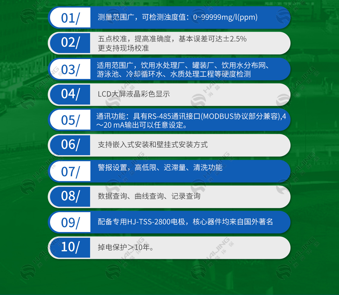 海晶HJ-TSS(F)濁度在線分析儀是一款帶微處理器的水質在線監測控制儀表,配備先進的濁度電極監測濁度值,靈敏度高,信號響應迅速,測量準確、性能穩定、維護簡單。廣泛用于工業廢水、地表水、飲用水、海水以及工業生產過程中對水溶液中的濁度含量進行連續監測和控制。