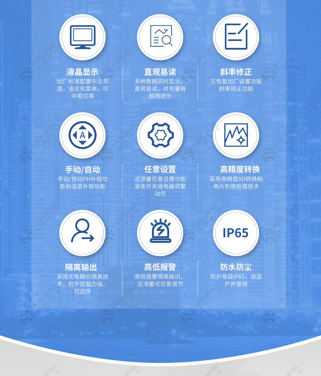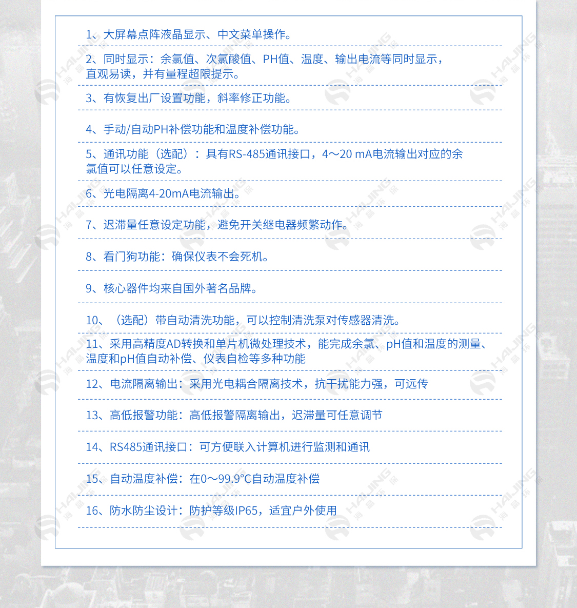 11、采用高精度AD轉換和單片機微處理技術,能完成余氯、pH值和溫度的測量、溫度和pH值自動補償、儀表自檢等多種功能
