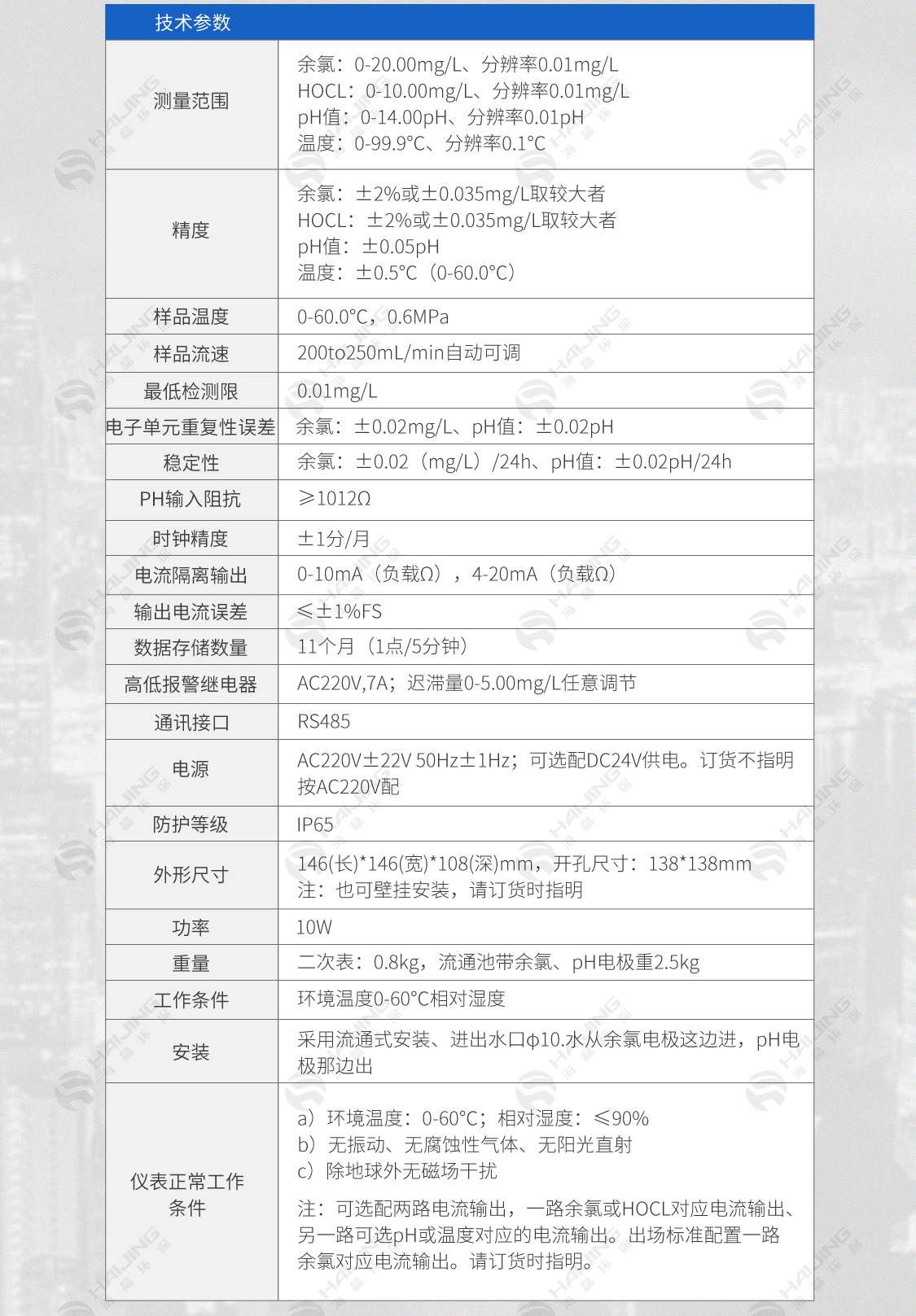 HOCL: 0~10.00mg/L 分辨率0.01mg/L