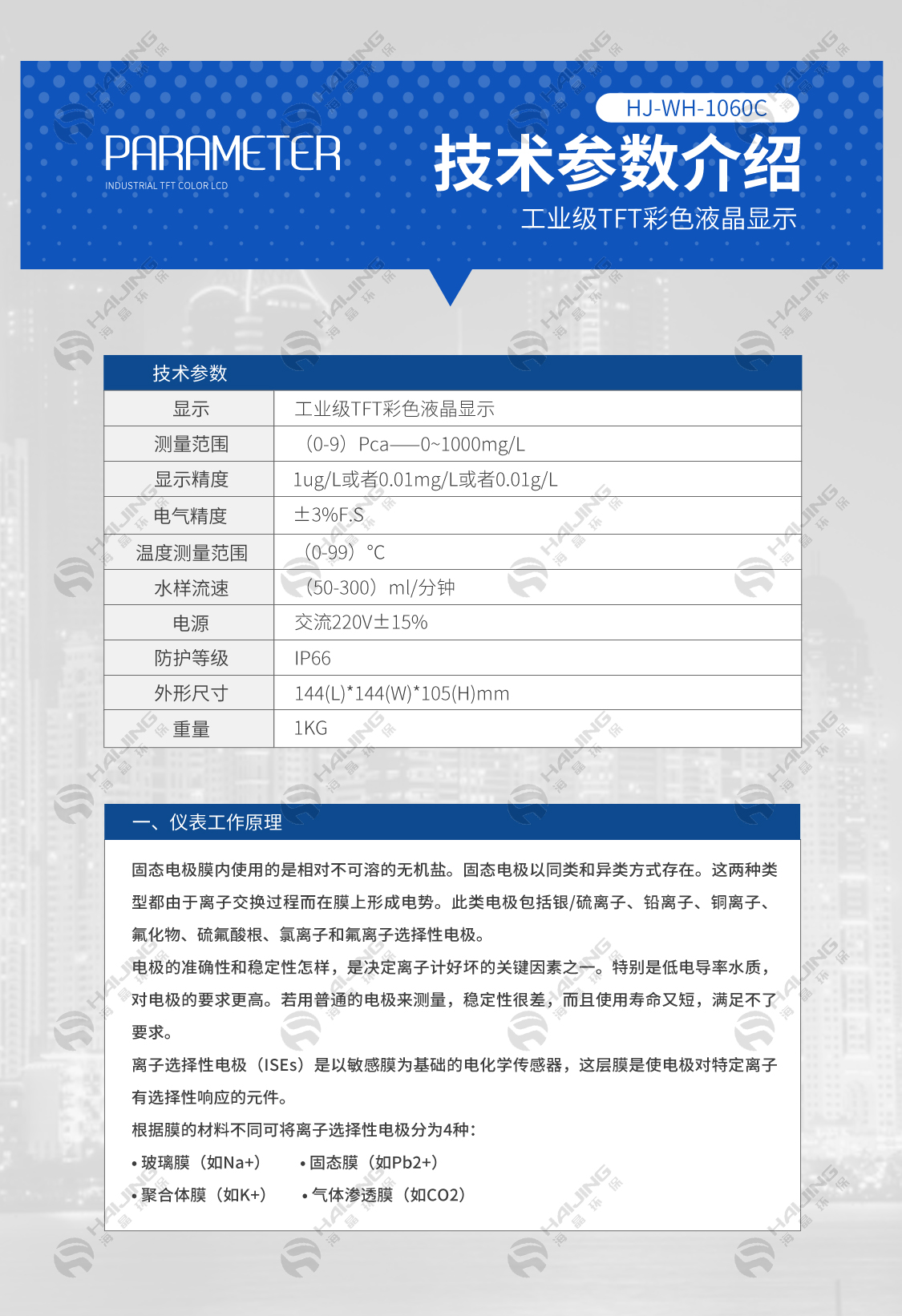 一、產品簡介 HJ-WH-1060C水硬度在線分析儀采用美國進口先進的水硬度選擇電極法(ISE法),靈敏度高,信號響應迅速,測量準確、性能穩定、維護簡單。該分析儀具有使用方便、準確度高、經