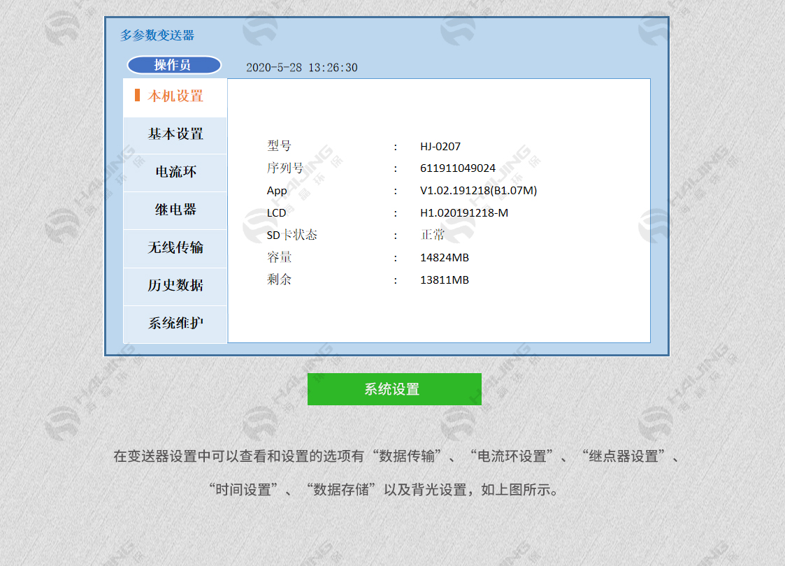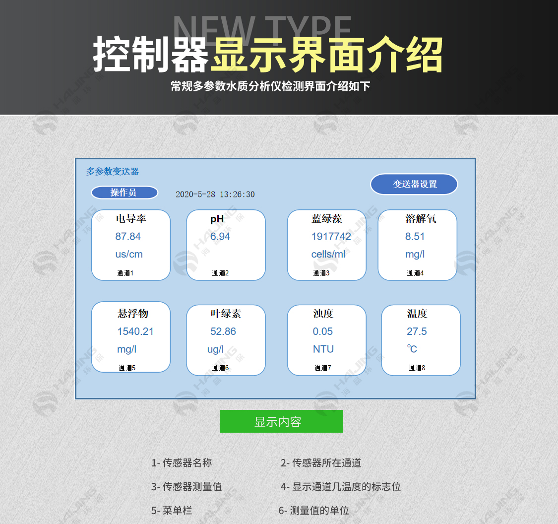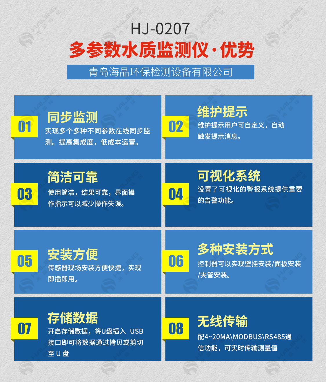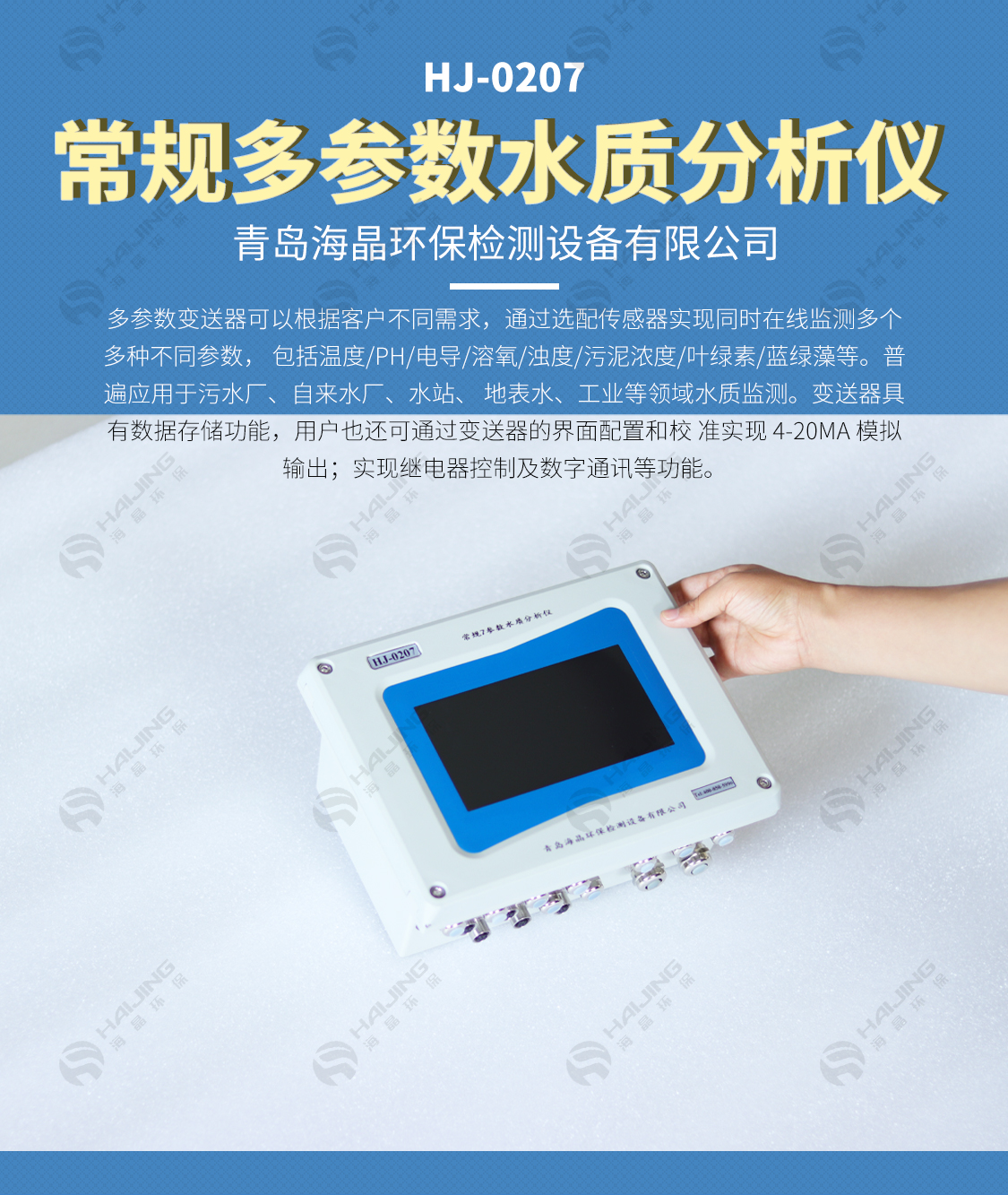 一、產品概述 HJ-0207型多參數水質分析儀可以根據客戶不同需求,通過選配傳感器實現同時在線監測多個多種不同參數值,包括溫度、PH、電導、溶氧、濁度、污泥濃度、葉綠素、藍綠藻等(參