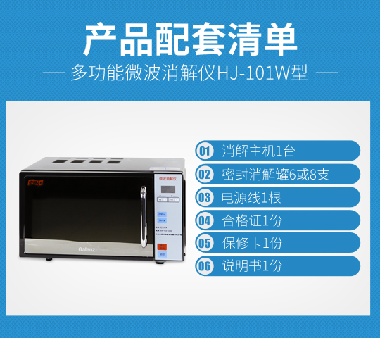 消解主機1臺,密封消解罐6支或8支,電源線1根,合格證、保修卡、說明書各一份。