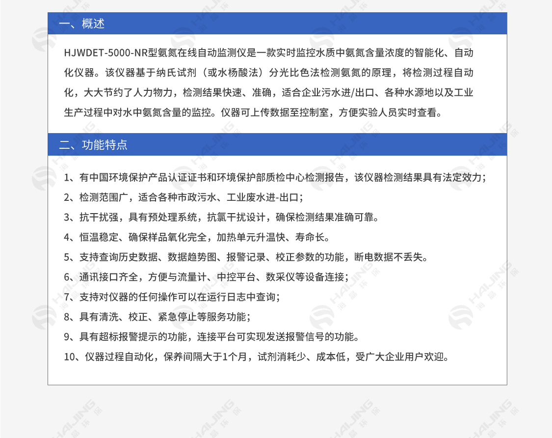 HJCODet-5000型COD在線監測儀的優勢 :海晶環保HJCODet-5000型COD在線分析儀是一種用于實時監測水體中化學需氧量(COD)的高精度儀器,廣泛應用于環境保護、水質監測和廢水處理等領域。相比傳統的實驗室檢測方法,海晶環保HJCODet-5000型COD在線分析儀具有顯著的優勢,主要體現在以下幾個方面:1. 實時監......
